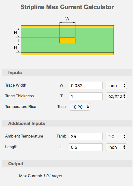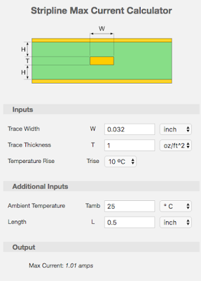 I looked at Sparkfun’s product page for board specs, but unfortunately there are none. So I downloaded board design files and opened them in Eagle. After examining the board layout, I’ve figured out that the trace width used on the board is 0.032”. Using EEWeb online PCB trace max current calculator, I’ve obtained the following estimation: