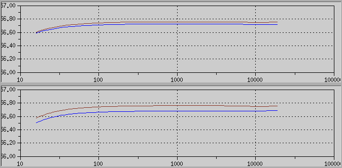 Not a big difference! The response is pretty much the same. Left / right balance has become a bit worse—because the amp had to be set at moderately low level. While finding the right volume setting I’ve noticed that the balance becomes pretty much skewed at very low volume level of CMoyBB (that’s normal for inexpensive headphone amps). Noise levels (bar graphs that LXsndtest displays under the spectrum graph) are pretty much the same, too.