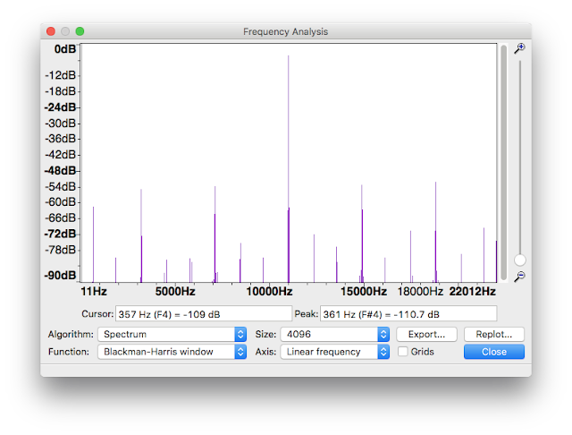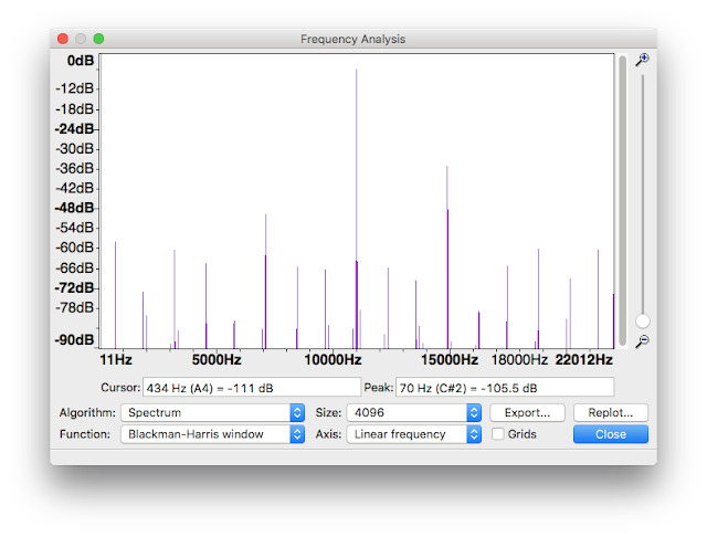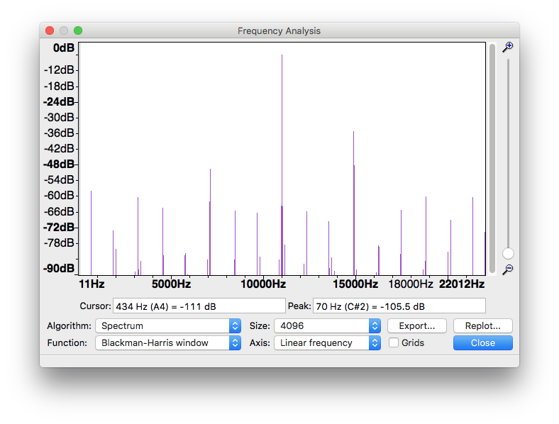 But here at least I can do something to fix that. I can’t change the sampling rate, but Dune offers digital volume control, even in dB scale. I used it to reduce the volume by 4 dB down, providing enough headroom for the resampler, and the result is a beautiful clean 11025 Hz peak: