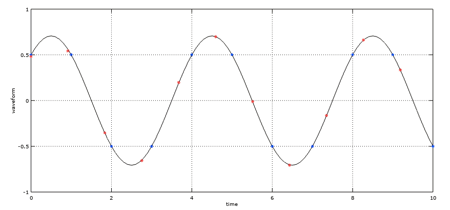 As you can see, at the 48 kHz sampling rate the dots are closer to each other, and some of the red dots have values of above (or below) the margins of the original 44.1 kHz sampling rate.