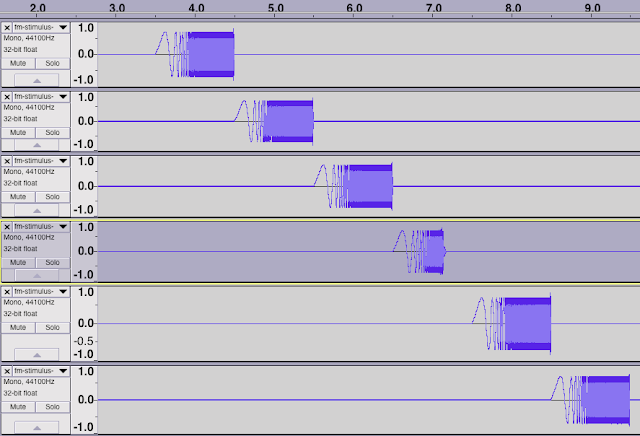 I needed a test sound file that is AC3-encoded and contains measurement sweeps in all 6 channels. For that purpose, I took the measurement sweep file generated by FuzzMeasure, and used Audacity in order to create a 6-channel file with a sweep in each channel: