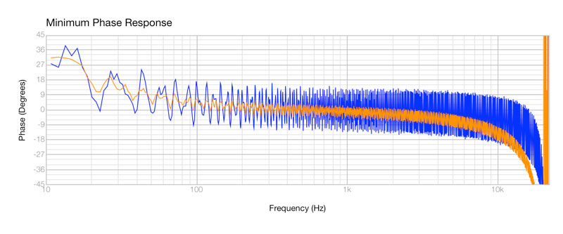 The measurements for the remaining channels are the same as for the left—at least this device is consistent for all channels. Below is left channel (blue) vs. LFE channel (yellow):