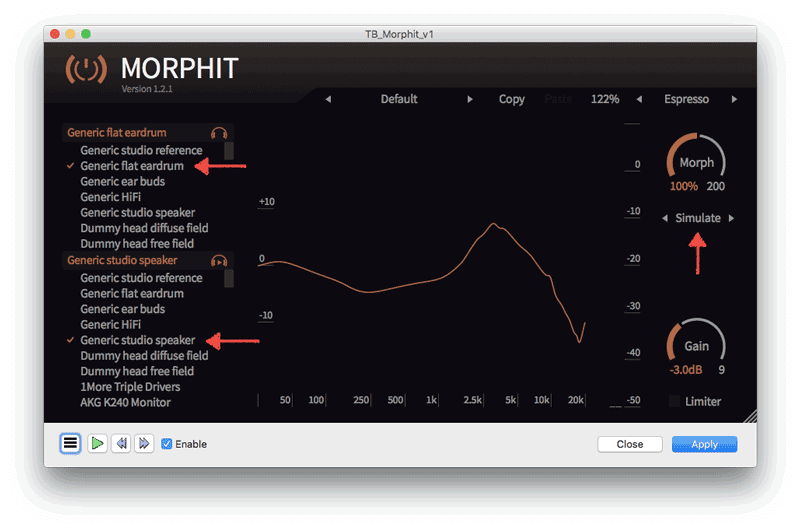 On the UI, Morphit shows the correction curve, not the target. But it’s easy to see the target curve as well—we need is to set the source EQ curve to flat, and the corresponding setting is called “Generic flat eardrum”. So, here is how we can see what “Generic studio speaker” target setting looks like:
