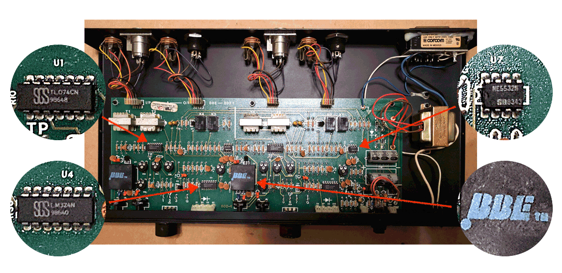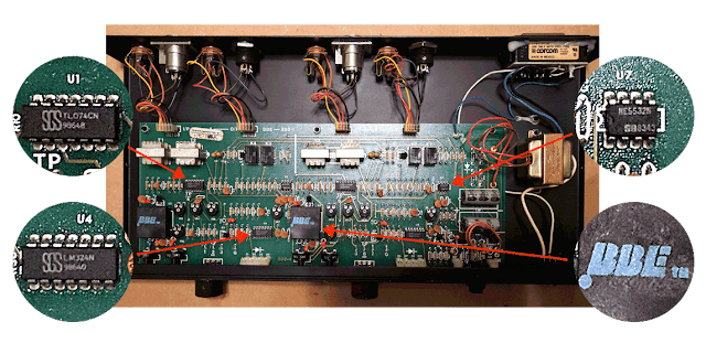 These are pretty much the same components that are used in the 882 model, except that 882 uses electronic balancing of inputs, and for that purpose it employs two more pairs of NE5532. Whereas 802 only uses old school transformer balancing (you can see a pair of small transformers per channel.)