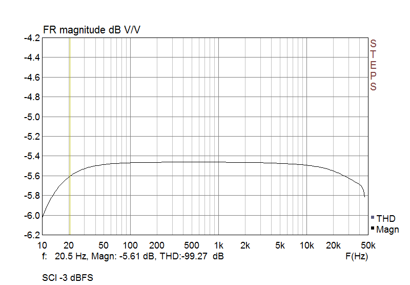 As we can see from the RMS figures, SCI attenuates the signal by almost 6 dB. It could be the reason why the bump between 2 and 3 kHz originally seen on MOTU loopback measurements is almost gone. If so, then it must be an artifact of MOTU’s line in.