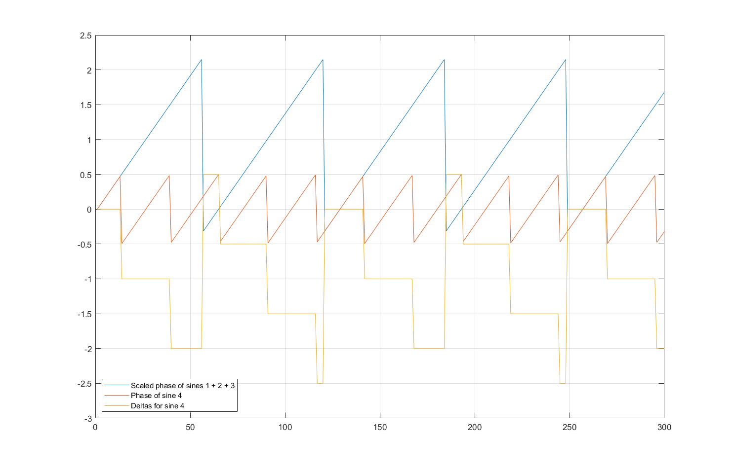 If we consider 0.5 as an unit on the Y scale then the scaled delay, having a range of 2.5, maps into a sequence of 2.5 / 0.5 = 5 integers: from 0 to 4 (A). And the current sine wave phase, having a range of 1, maps into a binary sequence (B). And because the sequence A has an odd number of elements, its parity flips when the sequence is restarted: