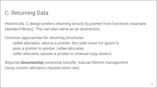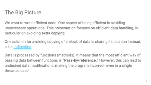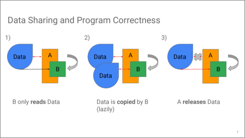 We strive to write modular code, where data processing is distributed among thousands of functions or methods (in object-oriented languages). Typically, when passing data between functions we need to decide whether we need to copy the data (which can be expensive) or rather use indirection and simply pass the address of memory where the data is stored. The usual concern when doing the latter is that it can lead to unexpected program behavior, because the contract for data ownership is often neither expressed formally, nor enforced. I’m not talking about data races that happen in multi-threaded code, but rather about getting unexpected results even in the case of a single thread of execution.