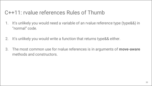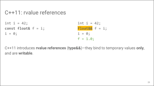 would be even more confusing;I’ve just said that having a writable reference to a temporary would be confusing. In fact, an rvalue reference type introduced in C++11 does exactly that—it binds to temporaries (and to temporaries only), and allows modifying them. Why on Earth would anyone want to do that?