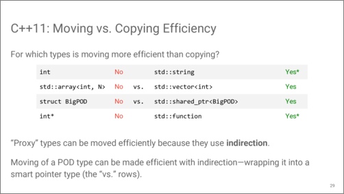 From the previous explanation it’s easy to see what types can be moved from more efficiently than copied. As an example, for primitive types and their aggregations “moving from” is equivalent to copying. But for “proxy” types that use indirection moving is more efficient.