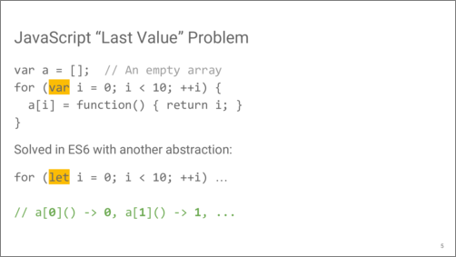 As an illustration of “unexpected behavior” of a single-threaded program due to misuse of indirection, here is an arcane problem that was often biting JavaScript programmers. For those who never programmed in JavaScript, you need to know that functions in JS are first-class objects and can be manipulated as easily as any other values, which includes dynamic creation of functions at runtime. When a function is created, it captures a subset of program state (it’s called “closure”).