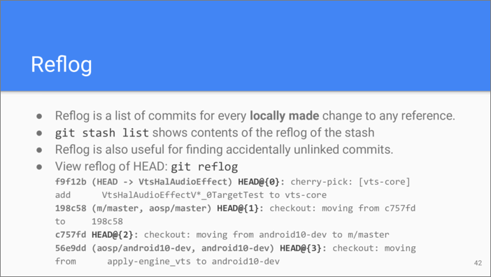 To answer the question, we introduce another powerful tool of Git—the Reflog. Speaking in terms of building blocks, this is just a list of commit hashes. The power comes from the fact that Git adds a node to this list every time any local reference changes. This includes HEAD, branch references, and Stash.