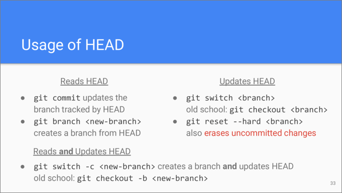 This is the already familiar diagram of the commit graph with branches. HEAD usually points to what is called “current” branch—the line of changes we are working on. Note that HEAD is a meta-reference—instead of pointing to a commit via its hash it instead contains the branch name, thus when we use HEAD, double dereferencing is needed to get to the commit.