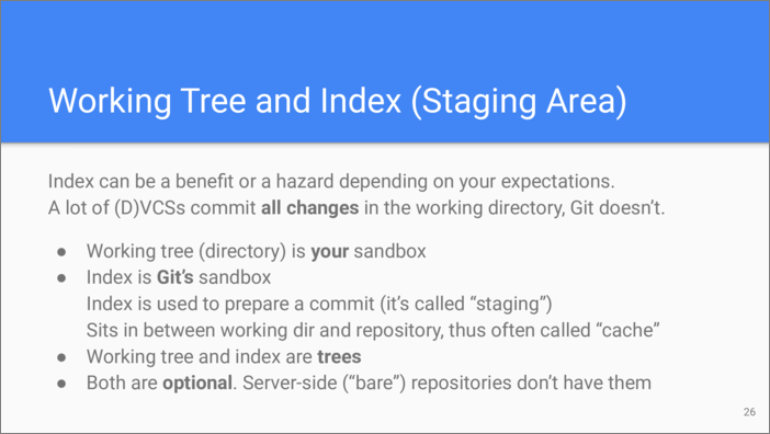 Let’s start with Working tree and Index. The Working tree is something that is understood by all Git users—it’s their sandbox where they do all your edits and file structure manipulations. It can be also referred to as “Working Directory”.