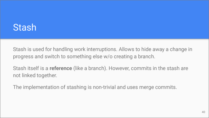 Enough with remotes, let’s talk about the tool that helps handling work interruptions. Sometimes you are in the middle of working on a change and then something unexpected happens: your previous change has caused a build break and a simple fix is needed immediately, or you’ve got some ideas and need to test them quickly on some other branch. You don’t want to lose your current changes, but you also don’t want to commit them as is.