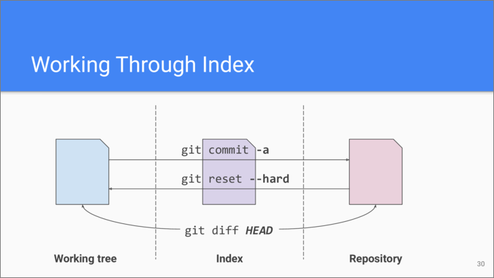 As for the Index, it’s a more confusing area and depending on your experience with other version control systems, index can be either a benefit or a hazard (rephrasing Rick Dekkard). Some version control systems do not have index, thus changes in the working tree are immediately committed into the repository. Not so with Git. Here, Index is an intermediate area where the next commit is staged. That’s why Index is also referred to as “Staging Area”. In order to commit a change to the file, it must be first registered with Index.