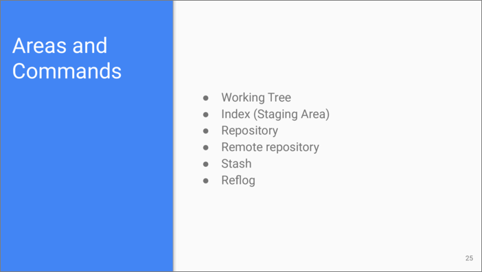 Let’s continue to the second part of the talk. Whereas the building blocks we were considering in the first part are more or less abstract and can be used for understanding generic principles of any distributed version control system, the areas and especially commands are specific to Git.