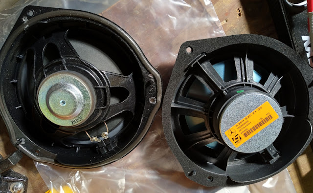 Anyways, this post is not about the car itself but rather about its audio system. Our car was stocked with the basic audio system called “Audio 20”. It wasn’t sounding very well. I could hear a lot of distortion and initially I was blaming the amplifier for this. However, when I’ve got a chance to look at the door speaker while overseeing a replacement of a broken passenger glass (a case of vandalism in Palo Alto, CA), I realized that this paper cone with a bit of magnetized steel can’t sound good in principle.
