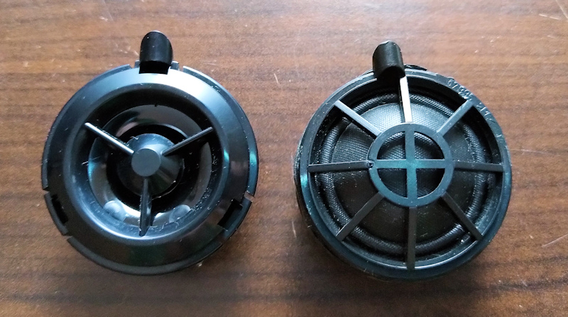 BTW, just by comparing how these drivers were built it’s easy to predict which of them sound good and which sound bad. The tweeter from the “basic” audio is a kind of a compression driver with a waveguide and a protective harness on top (on the left). From looking at this harness it’s easy to see that it will produce reflections right away, resulting in a comb effect. In contrast, a HKL7 tweeter (on the right) is a hard dome with a protective grid.