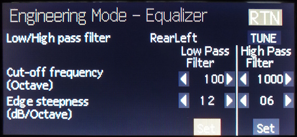 Fortunately, Audio 20 unit has an engineering menu (accessible by pressing “Hang Up”, “1”, and “#” buttons on the keypad simultaneously) that gives access to the equalizer and low- and high-pass filters for each door driver individually. I decided to leave to the rear door drivers the role of low frequency extensions, so I set up for them a low pass filter to 100 Hz with a 12 dB / octave roll-off: