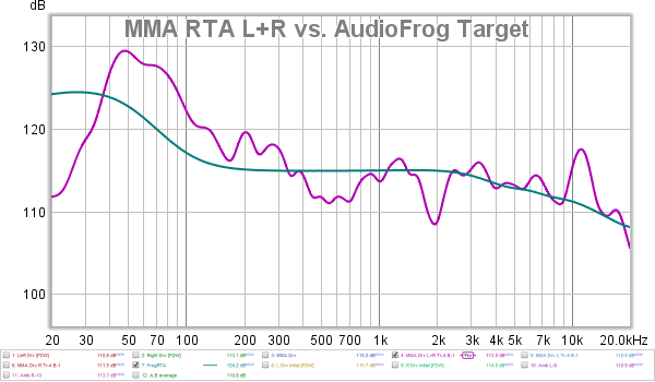 I’ve also made a moving microphone average measurement with both left and right channels playing, in the area where the driver’s head is (w/o the driver being there, of course) using Beyerdynamic MM-1 microphone with diffuse field calibration profile. Here it is compared to the target curve recommended by AudioFrog: