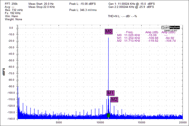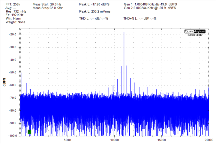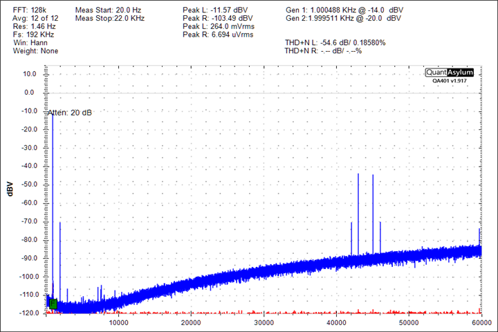 Note that the peaks on the left side (up to 6.5 kHz) is some artefact of using 16-bit test signal on a 24-bit device (RME). I tried another DAC (Cambridge Audio DacMagic Plus), another computer, switched from PC to Mac, tried 16-bit J-Test sample from HydrogenAudio forum, but these spikes on the left were always there as long as I was using 16-bit J-Test signal, and they were completely gone on 24-bit test signal. I suspect there must be something in the process of expansion of a 16-bit signal to 24-bit that makes them appear.