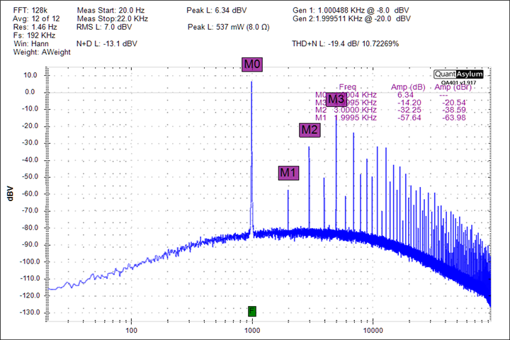 The specs sheet of LM4853 shows much better distortion figures than for TPA2005D1. I had configured the board in mono mode and tested it in the same setup as TPA2005D1: powered from a bench power supply (at 3.4 VDC) and driven by QA401 signal generator. The results were much better: