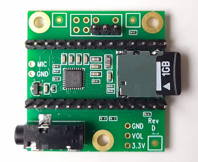 I’m putting a big rechargeable battery into this talking ABC, so higher power consumption isn’t a problem for me. Additional convenience of using the audio shield comes from the fact that it has mounting holes and an SD card for storing audio samples.