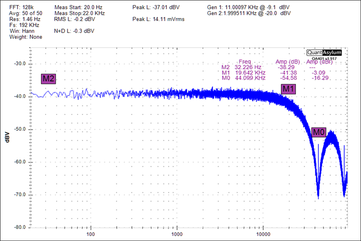 It’s interesting though, that being an unfiltered Class-D amplifier with 250 kHz switching frequency, this chip offers bandwidth which is enough to serve the full range of the QA401 DAC at 192 kHz sampling rate: