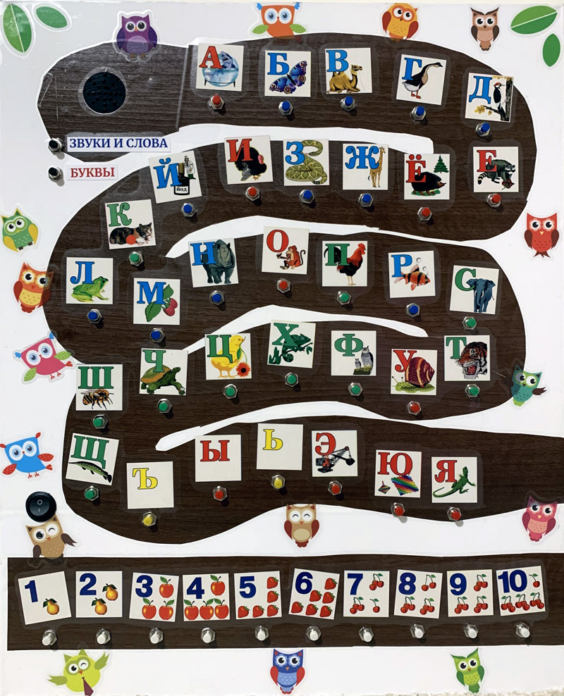 As for passive components—this toy needs buttons—a lot of them. The Russian alphabet has 33 letters, and I also needed 10 buttons for numbers, and 2 buttons for changing the mode. The ABC either pronounces the name for a letter, or the sound it stands for, along with the word on the picture: