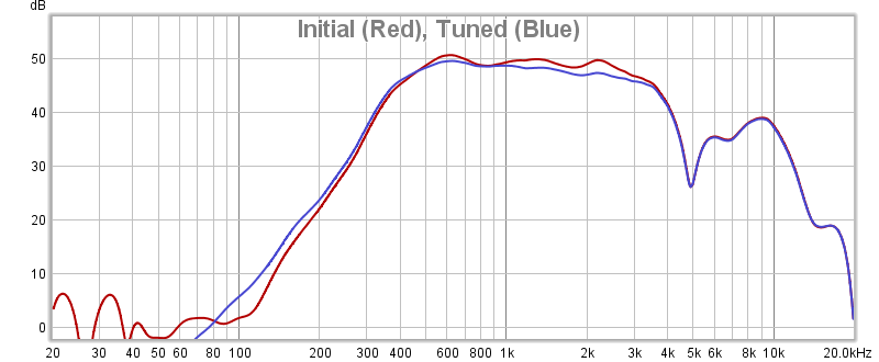 Below are frequency responses graphs below and after tuning. The main problem with this speaker / enclosure is the dip at about 5 kHz and following it—a huge scoop. This makes the overall sounding telephone-like, but it’s hard to do anything about it: