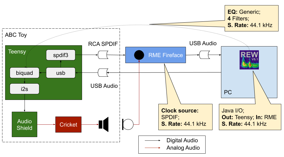 Teensy provides clock to RME Fireface and does playback. Fireface handles input from a measurement microphone. This arrangement has demonstrated solid correlation in Smaart, which means we are actually measuring the output of the system and can tweak it.