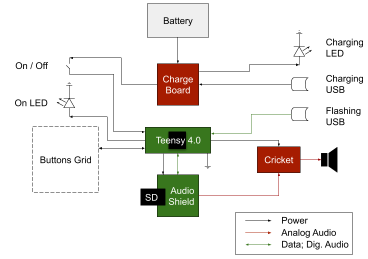 In a nutshell, the design of the ABC toy is pretty obvious: there is an input (buttons), an output (speaker), and the microcomputer (Teensy) which binds the things together. After my experiments with various audio options with Teensy, I’ve settled down on using the smaller version of Teensy (called 4.0) with Audio Shield which serves both as DAC, and as an SD card controller host, and “Noisy Cricket” amplifier to drive a single 0.5W speaker. The ABC is a standalone toy, so it must use a battery. I purchased a 2200 mAh, 3.7 V Li-Poly rechargeable battery and a charging board for it from Sparkfun. That’s all the electronics involved here.